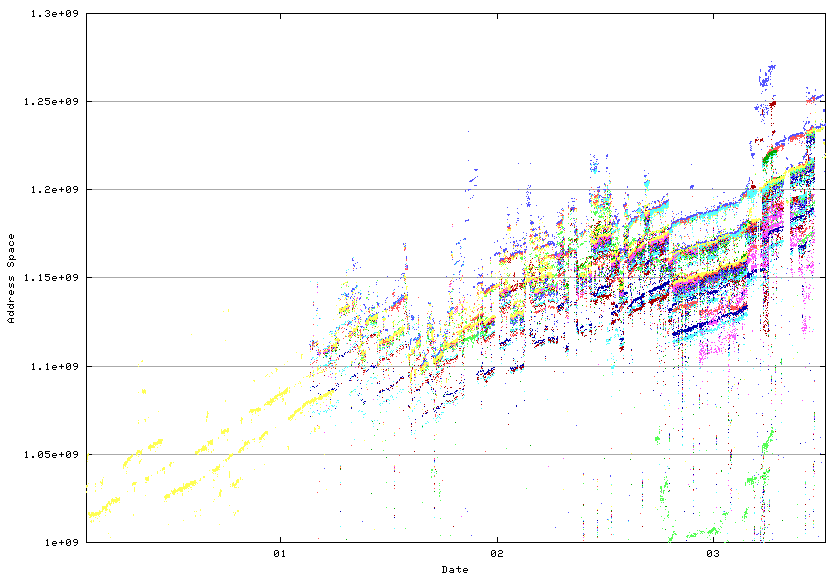 Route-Views has over 30 inter-domain routing peers, and each peer sends it a complete set of advertisements. The figure shows the amount of address space spanned by each peer over time. The measurements are taken every 2 hours, and the data spans from February 2000 until the present.