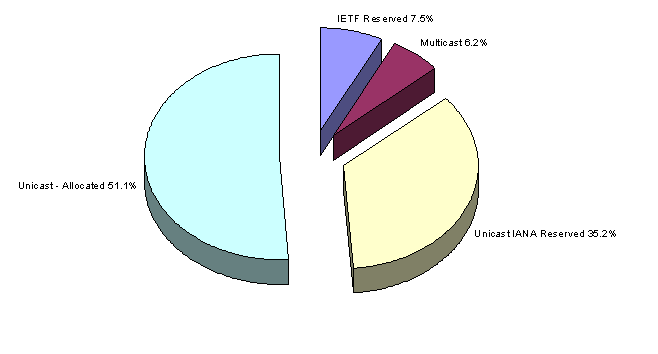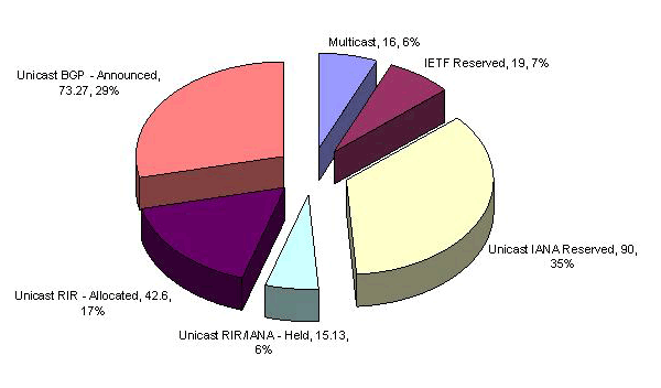 Some 29% of the space is announced in the BGP routing table, while 17% has been allocated to an end user or LIR but is not announced on the public Internet as being connected and reachable. 6% of the address space is held by the RIR's pending assignment or allocation (or at least there is no RIR recorded assignment of the space), while 35% of the total space remains in the IANA unallocated pool. A further 6% of the space is held in reserve by the IETF.