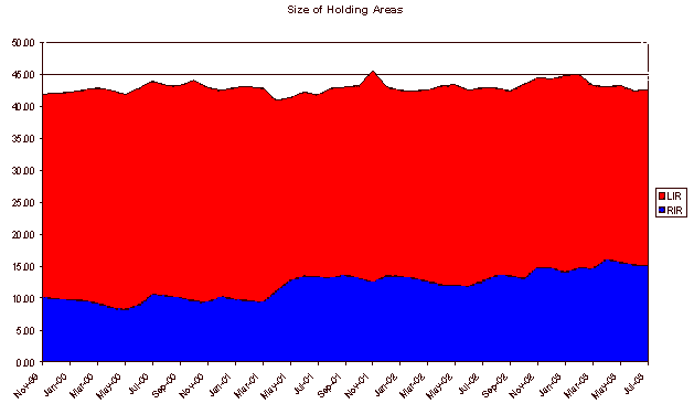 The amount of address space held by the RIR's grows slowly over time. There is a shorter period of oscillation imposed upon this pool, as each RIR will receive a /8 allocation from IANA when it's existing managed pool is assigned beyond a set threshold (currently 80% assigned), and this additional allocated space is then assigned to the same level before a new IANA allocation is made to the RIR. The rationale for the gradual increase in the pool size again lies in the slowly increasing assignation inefficiencies associated with managing increasingly larger address pools.