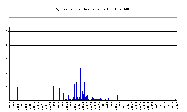 We can look back through the RIR allocation data and look at the allocation dates of unannounced address space. This view indicates that the bulk of the space is a legacy of earlier address allocation practices, and that since 1997, when the RIR operation was fully established, there is an almost complete mapping of RIR allocated address space to BGP routing announcements. (There is a set of allocations where no data is recorded for the assignment, and these appear to be the result of pre-1995 allocations. They are shown here with a date of January 1983.) The recent 2003 data indicates that there is some lag between recent allocations and BGP announcements, most probably due to the time lag between an LIR receiving an allocation and subsequent assignments to end users and advertisement in the routing table.
