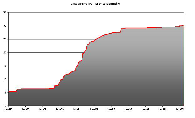 The slope of the growth of this unadvertised allocated address space in the period 1997 - 2002 is relatively small, so there is little growth in the unadvertised address space in recent time.