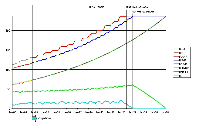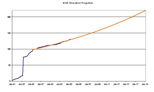 This form of extrapolation gives a date of 2026 for the time at which the RIR's will exhaust the number pool. If the withheld 16 /8's are bought into play, 2029 would be predicted by this approach.