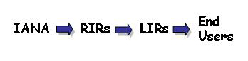 There are three stages in address allocation. The pool of IP addresses is managed by the Internet Assigned Numbers Authority, IANA. Blocks of addresses are allocated to Regional Internet Registries, who in turn allocate smaller blocks to Local Internet Registries (LIRs) or Internet Service Providers (ISPs).