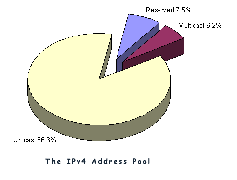 Currently there are 3,707,764,736 addresses that are managed in this way. It is probably easier to look at this in terms of the number of "blocks" where each block is the same size as the old Class A network, namely 16,777,216 addresses. The total address pool is 221 /8 s, with a further 16 /8's reserved for Multicast use, 16 /8's held in reserve, and 3 /8's are designated as not for use in the public Internet. So the way the address space as been divided up is shown in the following pie chart.