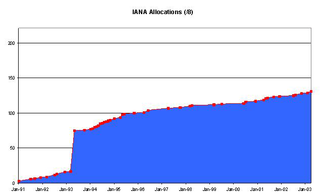 In this article I'd like to revisit a particular piece of analysis that has been a topic of considerable interest at various times over the past decade or more. The basic question is "how long can the IPv4 address pool last in the face of a continually growing network?" We've seen in the industry press at regular intervals dire reports that the IPv4 sky is falling and somewhere on the globe they've "'run out" of addresses. Once again it's probably time to take a more considered look at the problem and see what numbers come out from this exercise using data collected up to 2003.