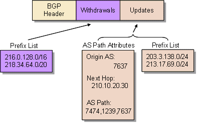 BGP operates as a reliable two party message passing protocol. BGP uses TCP as its transport protocol, eliminating the need to implement message fragmentation, retransmission, acknowledgment, flow control and sequencing within the protocol itself. The BGP speakers exchange Update Messages. These messages have three parts: a BGP Header, a (possibly null) list of withdrawals, corresponding to those prefixes where the peer BGP neighbour no longer has a valid path, and a set of updates where the peer BGP has installed a more preferred route, or has learned the route of a new prefix. The update section is split into two parts: the common AS path attributes, and the set of address prefixes. This is indicated in Figure 1.