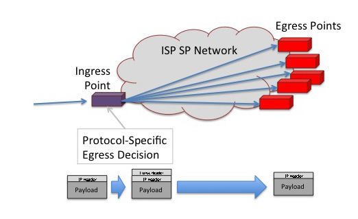 The ISP needs to be able accept packets from an external interface, determine the appropriate egress point for the packet within the context of the local network, and then ensure that the packet is passed out this egress interface. The internal network need not operate in the same protocol context as the protocol of the packets the network is handling. Viewed at a level of the minimal essentials, the network needs to be able to have some protocol-specific capability at its ingress points in order to determine each incoming packet's appropriate egress point, but thereafter during the transit of the SP network, the minimum necessary association to maintain is the identity of this pre-selected egress point with the packet. Now if the network uniformly supports the same protocol as the packet, then the same egress decision can be made at each forwarding point within the network. Alternatively, the packet can be encapsulated with an outer wrapper that identifies the egress point using the same protocol context as that used by the SP's internal switching elements, and the packet can be passed through the SP transit network using only this temporary wrapper to determine the sequence of forwarding decisions. MPLS networks are an excellent example of this form of approach, as are other forms of IP-in-IP encapsulation. The advantage of this approach is that the service provider network's internal infrastructure need not be altered to support additional carriage protocols: the changes to specifically support IPv6 are required only at the network's ingress elements, and a basic encapsulation stripping function is used at all egress points.