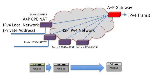 The handling of incoming packets is more challenging. Here the SP must forward the packet based not only on the destination IP address, but also on the port value in the TCP or UDP header, as there are now multiple CPE egress points that share the same IP address. A convenient way to do this is to take the dual-stack lite approach and use a IPv4-in-IPv6 tunnel between the CPE and the external A+P gateway. This A+P gateway needs to be able to associate each address and port range with the IPv6 address of a CPE (which it can learn dynamically as it decapsulates outgoing packets that are similarly tunnelled from the CPE to the A+P gateway). Incoming packets are encapsulated in IPv6 using the IPv6 destination address that it has learned previously. In this manner the NAT function is performed just once, at the edge, much as it is today, and the interior device is a more conventional form of tunnel server.