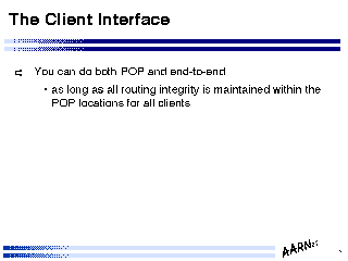 It is appropriate to place routing filters and configuration commands which generate a statically defined default route within this POP router. It is noted that this router is of course owned and operated by the network provider exclusively. No client requires (or should have) access to this router in any management capacity, other than operational hosting of the equipment under the terms of a remote hosting agreement. It is also noted that this router need not function in a dedicated mode for a single client, but is most effectively configured as a client concentrator, terminating a number of client circuits simultaneously.