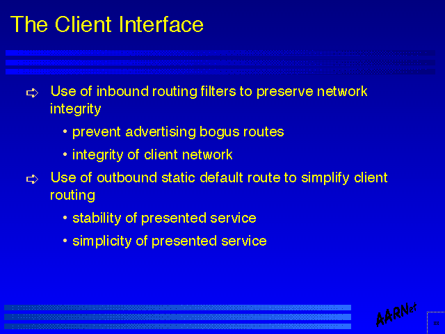 Both of these measures are intended to drastically simplify the routing interface between the client and provider. The incoming routing filters place the provider in the position of being able to only "believe" those routing advertisements from the client which are within the scope of the service agreement, allowing the provider to operate the network with a considerable level of inherent integrity, in a routing sense. The synthesis of a default route, and passing just this route to the client allows the client to immediately disseminate this route within the client network, again enhancing the overall stability and integrity of the end to end service.