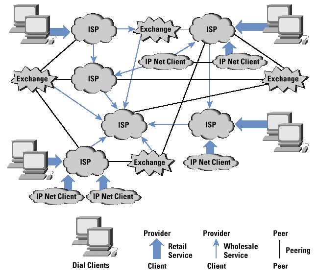 The resultant business environment is one characterized by a reasonable degree of fluidity, in which no clear delineation of relative roles or markets exists. The ISP market environment is, therefore, one of competitive market forces in which each ISP tends to create a retail market presence. However, no ISP can operate in isolation. Each client has the expectation of universal and comprehensive reachability, such that any client of any other ISP can reach the client, and the client can reach a client of any other ISP. The client of an ISP is not undertaking a service contract that limits connectivity only to other clients of the same ISP. Because no provider can claim ubiquity of access, every provider relies on every other provider to complete the user provided picture of comprehensive connectivity. Because of this dependent relationship, an individual provider's effort to provide substantially superior service quality may have little overall impact on the totality of client delivered service quality. In a best effort public Internet, the service quality becomes something that can be impacted negatively by poor local engineering but cannot be uniformly improved beyond the quality provided by the network's peers, and their peers in turn. Internet wholesale carriage services in such an environment are constrained to be a commodity service, in which scant opportunity exists for service-based differentiation. In the absence of service quality as an effective service discriminator, the wholesale activity becomes a price based service with low levels of added value, or in other words a commodity market.