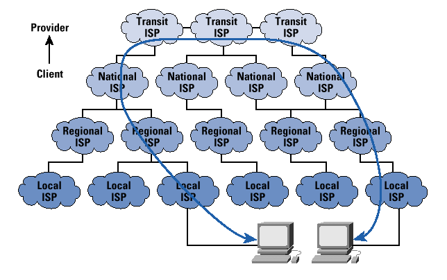 A strictly hierarchical model of Internet structure is one in which a small number of global ISP transit operators is at the "top;" a second tier is of national ISP operators; and a third tier consists of local ISPs. At each tier, the ISPs are clients of the tier above, as shown in Figure 2. If this hierarchical model is strictly adhered to, traffic between two local ISPs is forced to transit a national ISP, and traffic between two national ISPs transits a global ISP even if both national ISPs operate within the same country. In the worst case, traffic between two local ISPs needs to transit a national ISP, then a global ISP from one hierarchy, then a second global ISP, and a second national ISP from an adjacent hierarchy in order to reach the other local ISP. If the two global providers interconnect at a remote location, the transit path of the traffic between these two local ISPs could be very long indeed.