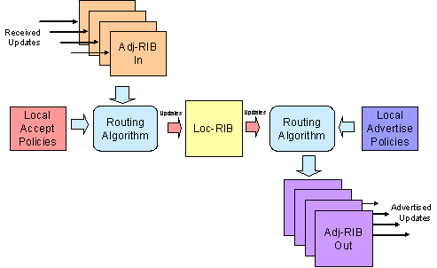 In processing this update message, the local BGP speaker updates a local adjacency state that is being maintained with the BGP peer, removing withdrawal routes, and adding or modifying the updated routes. The changes to this adjacency state (or “Adj-RIBs-In” to draw from the terminology used in conceptual BGP model as described in draft-ietf-idr- bgp4) are then processed by the BGP routing algorithm, which uses the BGP route preference rules, coupled with local policy configuration to determine if there are any changes to the local BGP routing state (or “Local Routing Information Base”, or “Loc-RIB” to again draw from the conceptual framework). Any changes to the Loc-RIB generate changes in the local state that are passed to BGP neighbours, so these updates are entered in to the Adj-RIBs-Out for subsequent announcement in BGP Update messages to peer ASes. The local forwarding process also processes these changes to the loc-RIB to determine what , if any, changes need to be made to the local forwarding table. (Figure 2)